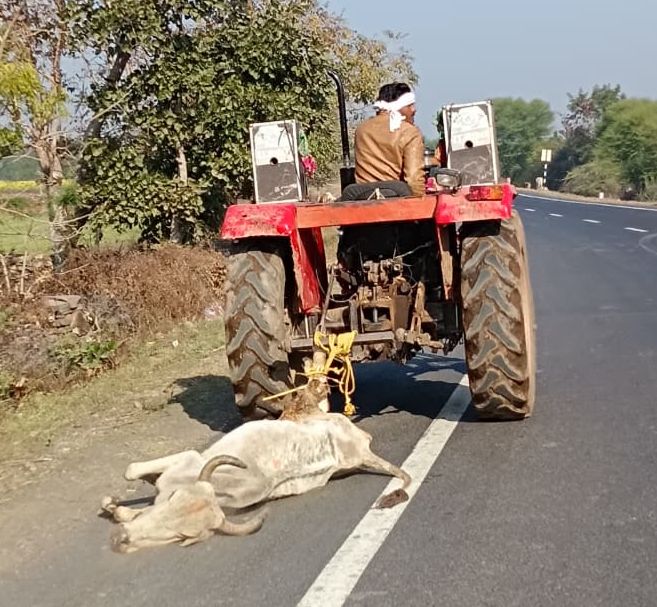 गांव में सोमवार सुबह एक मृत गाय को ट्रैक्टर से घसीटने का मामला सामने आया है। यह घटना नेशनल हाईवे क्षेत्र की बताई जा रही है, जहां सुबह के समय एक ट्रैक्टर मृत गाय को सड़क पर घसीटते हुए ले जाता दिखाई दिया। घटना का वीडियो सोशल मीडिया पर सामने आने के बाद ग्रामीणों और राहगीरों में भारी नाराजगी देखने को मिली।