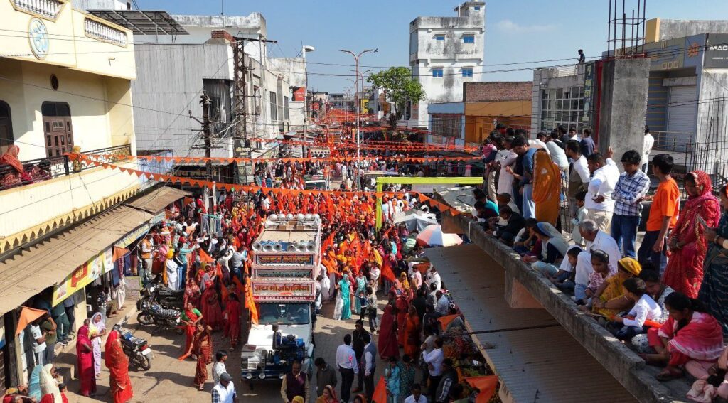 कार्यक्रम के तहत चारभुजा नाथ चौक से भव्य जुलूस निकाला गया। जुलूस में सिर पर कलश धारण किए हुए सैकड़ों महिलाएं पारंपरिक वेशभूषा एवं चुनरी में शामिल हुईं, जबकि पुरुष श्वेत वस्त्रों के साथ भगवा परिधान धारण किए हुए हाथों में धर्मध्वज लिए चल रहे थे।