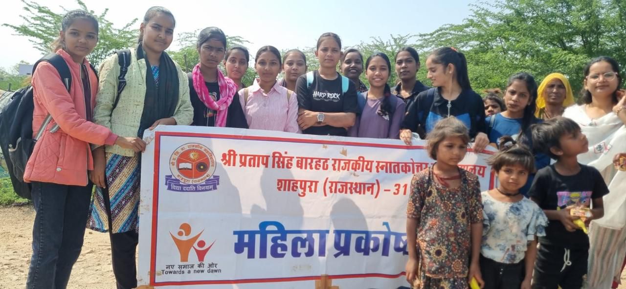 शाहपुरा@(किशन वैष्णव)श्री प्रताप सिंह बारहठ राजकीय महाविद्यालय में महिला प्रकोष्ठ के तत्वावधान में राजस्थान राज्य महिला नीति की विभिन्न गतिविधियों के अन्तर्गत प्राचार्य डाॅ. पुष्कर राज मीणा के निर्देशन में छात्राओं ने शाहपुरा की गांछा बस्ती में निराश्रितों की सामाजिक एवं आर्थिक समस्याओं को जानने एवं समझने हेतु शैक्षिक भ्रमण किया। महिला प्रकोष्ठ संयोजक डाॅ. ऋचा अंगिरा ने इस भ्रमण के दौरान ही छात्राओं को विभिन्न समाजिक समस्याओं एवं विभिन्न संस्थानों जैसे वृद्धा आश्रम, अनाथ आश्रम आदि के बारे में विस्तृत जानकारी प्रदान कर समाजिक समस्याओं के प्रति सहानुभूतिपूर्ण एवं सहायतापूर्ण दृष्टिकोण विकसित करने का प्रयास किया, साथ ही उन्होनें व्यवहारिक दृष्टिकोण से उनकी समस्याओं को समझकर उनके समाधान के उपाय भी सुझाएं।
