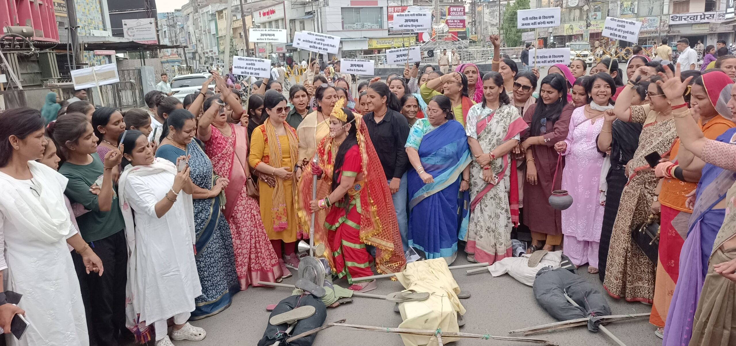 पदयात्रा जब सूचना केंद्र स्थित बजरंगी चौराहे पहुंची, तो वहां प्रदर्शन के दौरान मां दुर्गा का रूप धारण किए महिला ने इन पुतलों का त्रिशूल से ‘संहार’ किया, जो नारी शक्ति के क्रोध का प्रतीक बना। आक्रोश की पराकाष्ठा तब देखने को मिली जब महिलाओं ने उन पुतलों को चौराहे पर रखे कूड़ेदान में डाल दिया। महिलाओं ने दो टूक शब्दों में कहा कि महिला सम्मान और अधिकारों के प्रति सड़ी-गली मानसिकता रखने वाले नेताओं की सही जगह कूड़ेदान ही है।