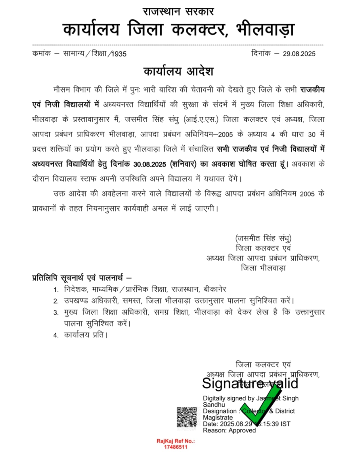 भीलवाड़ा। जिला कलेक्टर जसमीत संधू ने एक आदेश जारी कर शहर व जिले के सभी सरकारी एवं निजी विद्यालयों में शनिवार का अवकाश घोषित किया है।