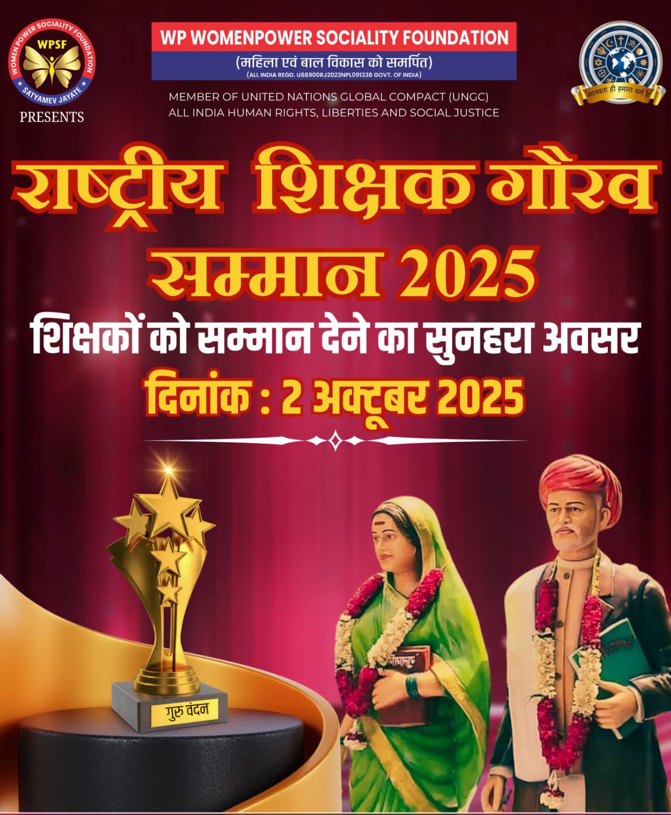 जयपुर। वूमेन पॉवर सोशलिटी फाउण्डेशन परिवार ने आपके लिए समर्पित भाव से सभी गुरुजनों को आजीवन सदस्यता ग्रहण करवाते हुए। अनेकों लाभ पहुंचाने का यह प्रयास कर कार्यक्रम आयोजित करने का कदम उठाया है। WPSF की आजीवन सदस्यता ग्रहण कर कन्या शिक्षा के हितों में सभी शिक्षक ,सरकारी/गैर सरकारी क्षेत्रों संस्थाओं, समाज सेवियों द्वारा सहायता प्रदान कराने के पुण्य कार्य के भागीदार /प्रेरणा बने। राष्ट्रीय शिक्षक गौरव सम्मान (गुरु वंदन) प्रेरणा शक्ति देता है, कि गरीब, वंचित, असहाय, जरूरत मंद परिवारों के छात्र/छात्राओं को समर्पित भाव से शिक्षा में आगे बढ़ने की योजना से जानकारी द्वारा सहायता दिलवाना मुख्य उद्देश्य रहे। कन्या हितों में शिक्षा सहायता दिलवाना एवं उच्च शिक्षा हेतु सहयोग दिलवाना, एवं प्रति वर्ष कन्या शिक्षा सम्मान समारोह में सा सम्मान अहम भागीदारी निभाना।