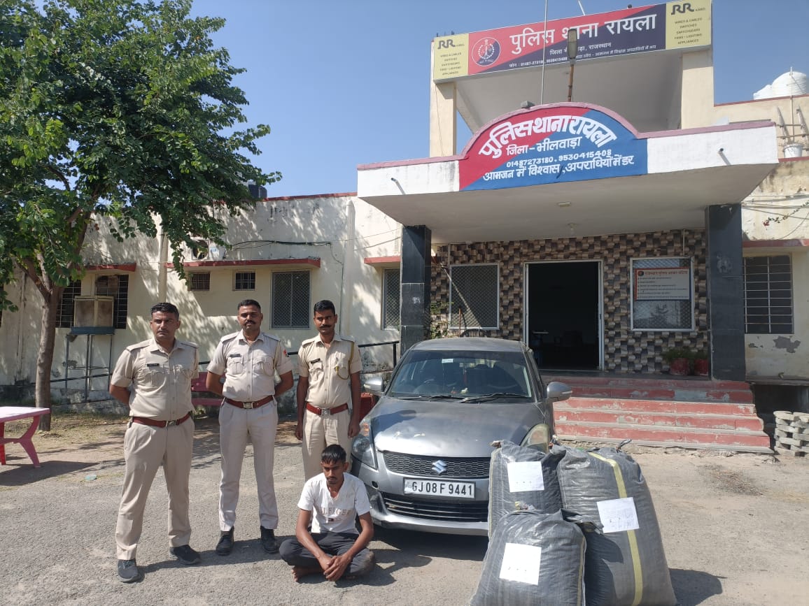 मंगलवार को रायला थानाधिकारी भगवान चैधरी के नेतृत्व में पुलिस टीम द्वारा रायला-गुलाबपुरा रोड पर नाकाबंदी की जा रही थी। इसी दौरान एक सफेद रंग की स्विफ्ट कार (नंबर त्श्र 08 म्थ् 9441) को रोकने का प्रयास किया गया। पुलिस को देखकर कार चालक ने वाहन को तेज गति से उत्तर दिशा की ओर भगाने का प्रयास किया, जिस पर पुलिस ने पीछा कर कार को रोक लिया।