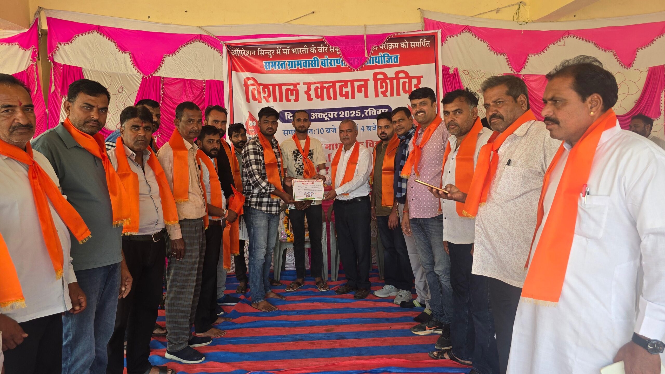 भीलवाड़ा | सहयोग सेवार्थ फाउंडेशन भीलवाड़ा एवं समस्त ग्रामवासी बोराणा के तत्वावधान में रविवार को ऑपरेशन सिंदूर के तहत भारतीय सेना को समर्पित विशाल रक्तदान शिविर का आयोजन राजकीय उच्च माध्यमिक विद्यालय बोराणा में किया गया। शिविर में देशभक्ति के नारों के बीच 102 यूनिट रक्त संग्रह किया गया, जिसे भारतीय सेना के वीर जवानों को समर्पित किया गया।