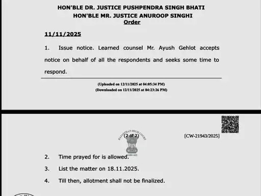 भीलवाड़ा शहरी सुधार न्यास (यूआईटी) की विवादित भूखंड लॉटरी आवंटन योजना पर राजस्थान हाईकोर्ट, जोधपुर की खंडपीठ ने स्टे ऑर्डर जारी किया है। न्यायाधीश डॉ. पुष्पेंद्र सिंह भाटी और अनुरूप सिंघी की खंडपीठ ने भ्रष्टाचार और सॉफ्टवेयर हेराफेरी के आरोपों वाली जनहित याचिका पर सुनवाई की। इसके चलते आदेश दिया कि अगली सुनवाई तक अलॉटमेंट लेटर जारी न किया जाए, जिसके परिणामस्वरूप आवंटन प्रक्रिया पर रोक लग गई है।