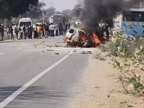 चूरू । चूरू में सवारियों से भरी बस की टक्कर के बाद CNG कार में ब्लास्ट हो गया और आग लग गई। कार में फंसे ज्वेलरी व्यवसायी की जिंदा जलने से मौत हो गई।
