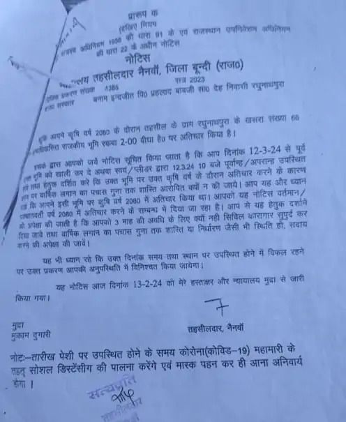 रघुनाथपुरा निवासी इंद्रजीत पुत्र प्रहलाद की मौत 17 अक्टूबर 2016 को हो चुकी थी। लेकिन फरवरी 2024 में पटवारी की रिपोर्ट के आधार पर नैनवां तहसीलदार राम राय मीणा ने इंद्रजीत के नाम नोटिस जारी कर दिया। नोटिस में लिखा गया कि इंद्रजीत ने खसरा संख्या 66 की 2 बीघा सरकारी जमीन पर अतिक्रमण कर रखा है और एक महीने में खुद अतिक्रमण हटाना होगा।