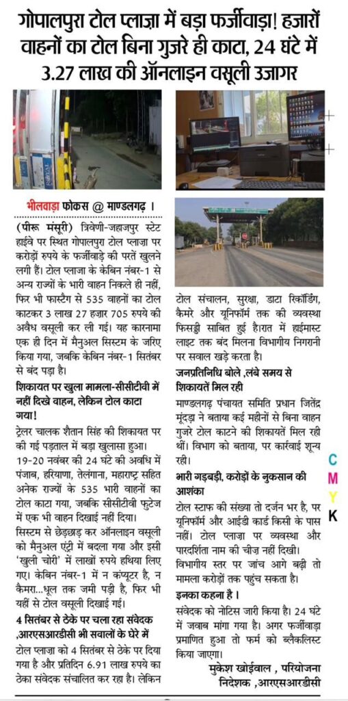 त्रिवेणी–जहाजपुर स्टेट हाइवे पर स्थित गोपालपुरा टोल प्लाजा पर फास्टैग से लाखों की अवैध ऑनलाइन वसूली का बड़ा फर्जीवाड़ा उजागर होने के बाद भीलवाड़ा फोकस की खबर का तुरंत असर देखने को मिला। फोकस द्वारा किए गए खुलासे और सीसीटीवी रिकॉर्डिंग में सामने आए तथ्यों के बाद टोल कंपनी और पुलिस हरकत में आई और जल्दबाजी में सिर्फ एक टोल कर्मी के खिलाफ मामला दर्ज कर दिया। जबकि फर्जीवाड़े में पूरा सिस्टम सवालों के घेरे में है।