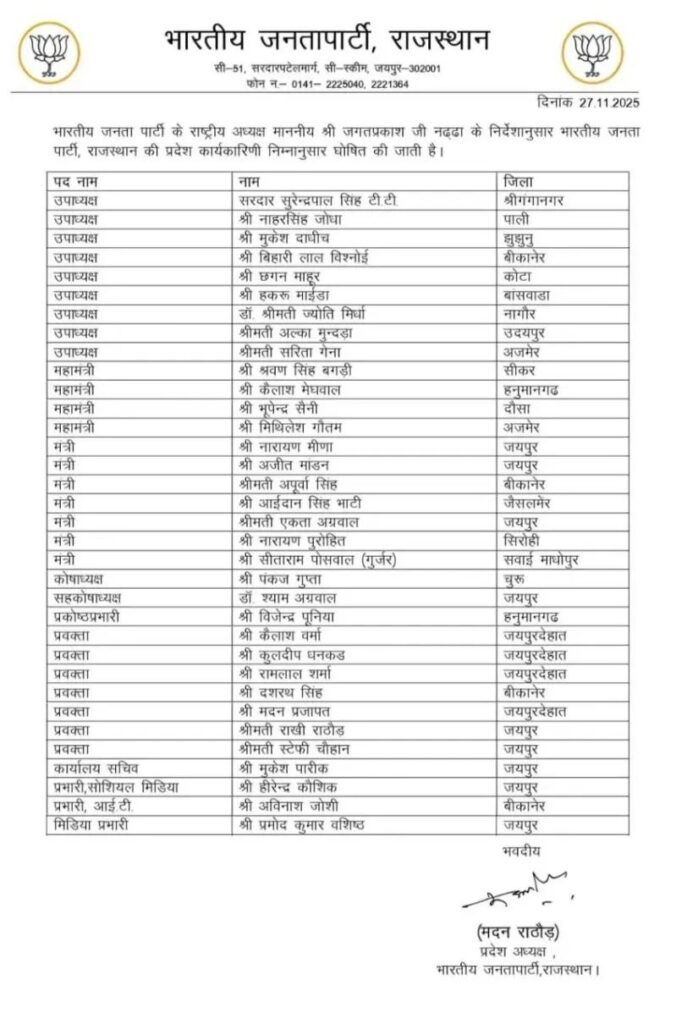 लंबे इंतजार के बाद राजस्थान भाजपा ने नई कार्यकारिणी घोषित कर दी है। प्रदेश भाजपा की नई टीम में 34 नामों का एलान किया गया है।