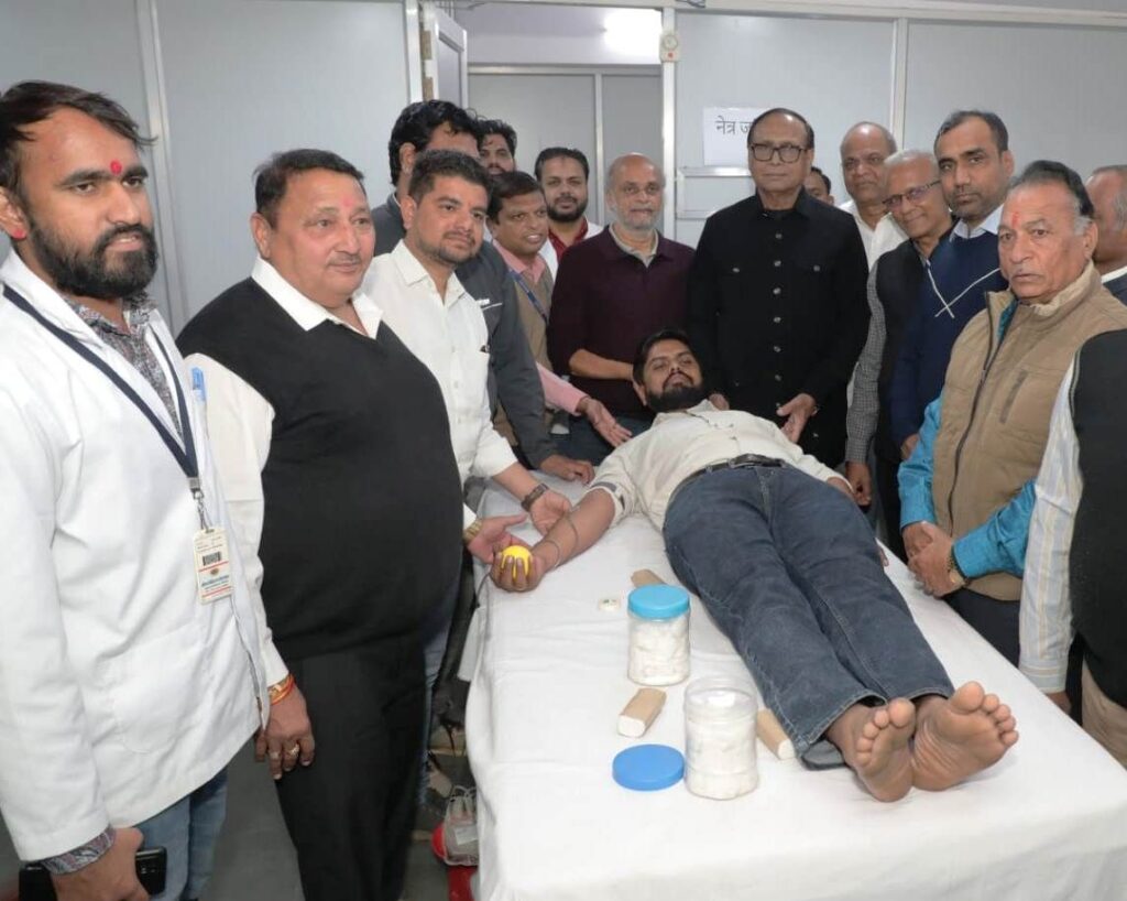 *भीलवाडा (पंकज पोरवाल)।* इंडियन रेडक्रास सोसाइटी द्वारा सेन युवा एकता मंच एवं फेडरल बैंक लिमिटेड के सहयोग से अरिहंत हास्पीटल भीलवाड़ा मे वृहद चिकित्सा शिविर के साथ रक्तदान का आयोजन किया गया। जिसमे अरिहंत हास्पीटल की ब्लड बैंक टीम द्वारा 51 रक्तदाताओं की मोतियाबिंद, फैफड़े, शुगर, आई विजन, ब्लड प्रेशर के साथ हीमोग्लोबिन की भी जांच की गई। कार्यक्रम की अध्यक्षता भीलवाड़ा विधायक अशोक कोठारी ने की। कोठारी ने इस अवसर पर देश एवं राज्य स्तर पर समाज मे आ रही जागरूकता पर प्रसन्नता व्यक्त की ओर रेडक्रास द्वारा समय समय पर किये जा रहे सेवा कार्याे पर प्रकाश डाला। रेडक्रास भीलवाड़ा के चैयरमेन लादूराम बांगड़ ने रेडक्रास द्वारा सेवा कार्यक्रमों के साथ जब भी जरूरत पड़ी रेडक्रास ने भीलवाड़ा मे अपनी उपस्थिति को साबित किया।