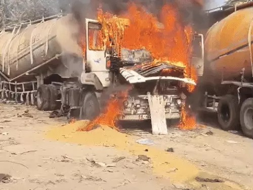 पेट्रोल-पंप से 300 मीटर दूर खड़ें टैंकर में लगी आग:पास खड़े धान के ट्रक की त्रिपाल भी जली, 5 मिनट में पहुंची दमकल की गाड़ियां